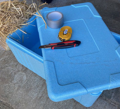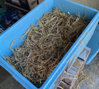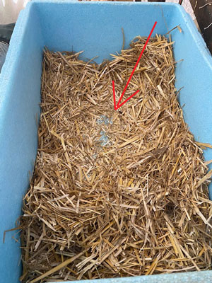 | Mit Stroh füllen (nicht zu viel, das Stroh ist nur als Unterlage gedacht, die Wärme kommt von der Thermobox). |